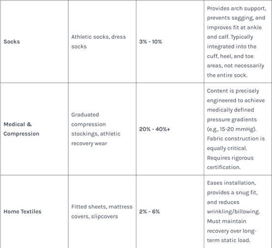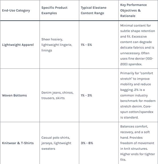 Table 1: Typical Elastane Content Ranges by Application and Fabric Type